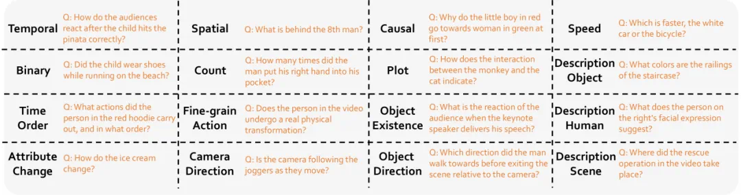 数据创建中用于生成视频问答对的问题类型。对于每种类型,我们提供其名称和示例问题。