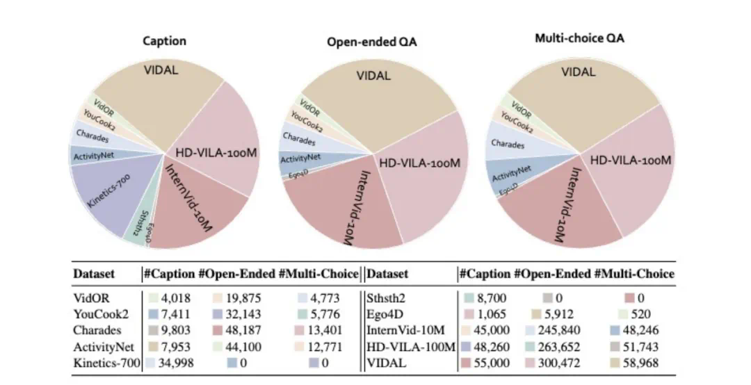 我们从收集到的数据源中精心挑选,以形成一个平衡且全面的集合,最终得到总共 178K 个视频和 1.3M 个指令跟随样本。这包括 178K 个视频描述、960K 个开放式问答和 196K 个多项选择问答。