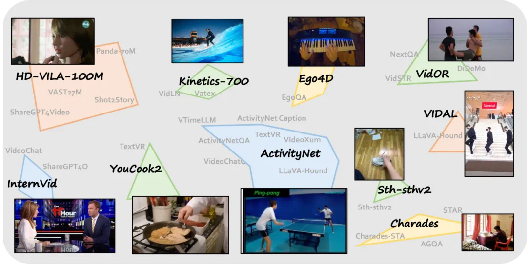 我们注意到,尽管不同的视频语言数据集侧重于各种视频理解任务,但大多数都来源于十个主要视频来源,这些来源提供了广泛的来自不同网站、拍摄视角和题材的视频。下图展示了这十个我们选择的视频数据集与其他现有视频语言数据集之间的关系。进一步,我们从这些来源中选择了动态视频,详细的选择逻辑在论文中描述。