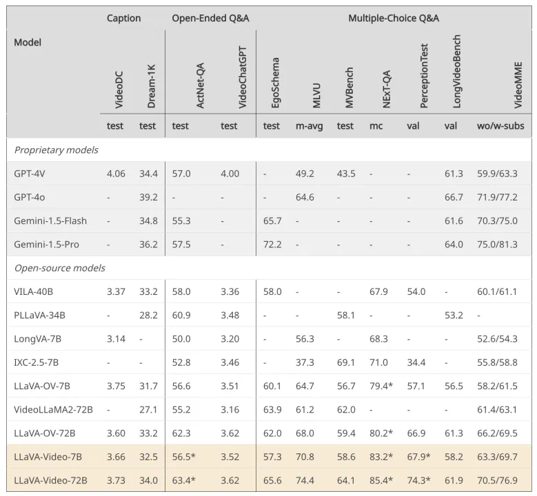 LLaVA-Video 的表现。对于 VideoDC 和 VideoChatGPT 的,我们使用 5 分制度打分,其他评测集结果以准确率打分。所有结果均为 0-shot 准确率。* 表示该评测集的训练集已在我们的训练集中使用。