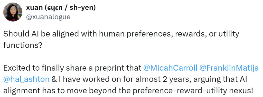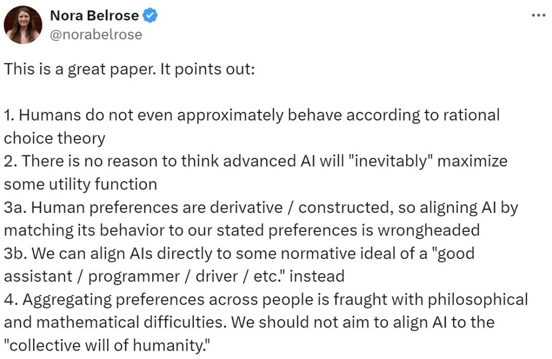 人类偏好是推断出来的或构建起来的,因此将 AI 的行为与我们表述出来的偏好对齐是错误的方向;相反,我们可以将 AI 直接与「优秀助手 / 程序员 / 司机等」规范性理想目标对齐; -