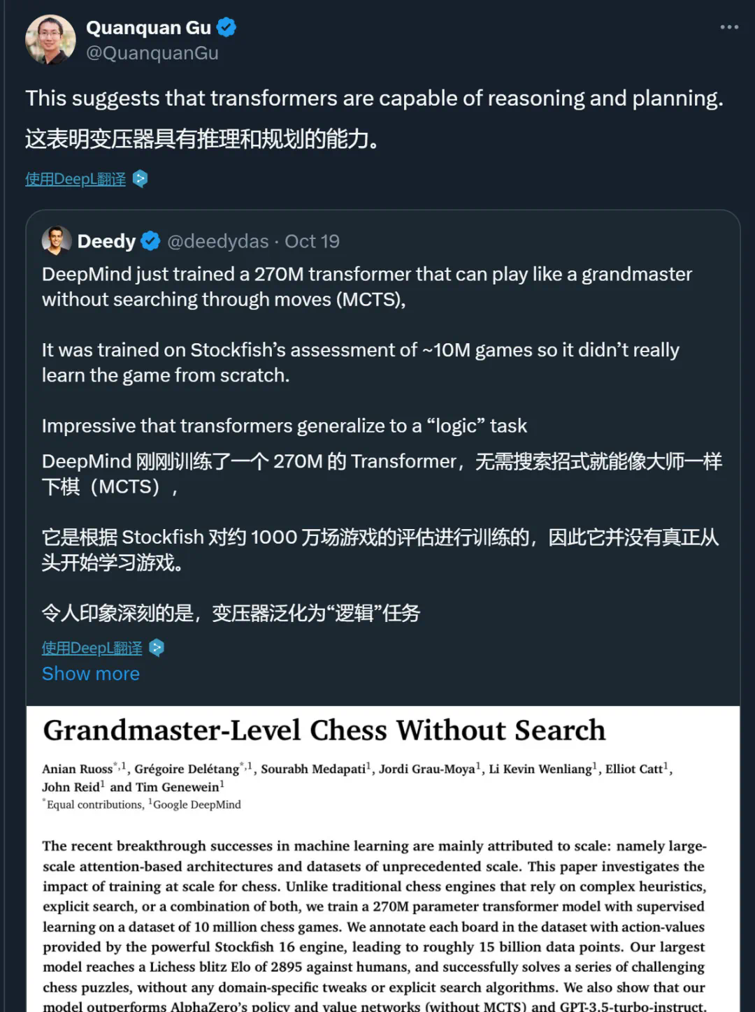 最近一段时间,随着 OpenAI o1 模型的推出,关于大型语言模型是否拥有推理能力的讨论又多了起来。比如苹果在前段时间的一篇论文中指出,只要给模型一些干扰,最聪明的模型也会犯最简单的错误(参见《给小学数学题加句「废话」,OpenAI o1 就翻车了,苹果新论文质疑 AI 推理能力》)。这种现象被归结为「当前的 LLM 无法进行真正的逻辑推理;相反,它们试图复制在训练数据中观察到的推理步骤」。然而,事实真的是这样吗?谷歌 DeepMind 的一篇论文似乎得出了相反的结论。