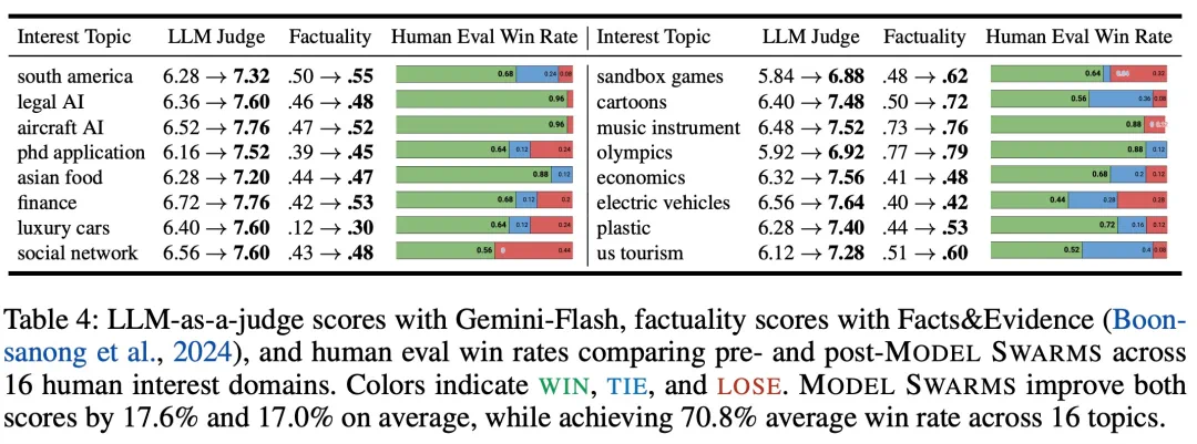 人类兴趣:在人类评估的 16 个主题(例如,电动汽车和博士申请)上,MODEL SWARMS 在 85% 的情况下产生了与现有模型相当或更好的专家。