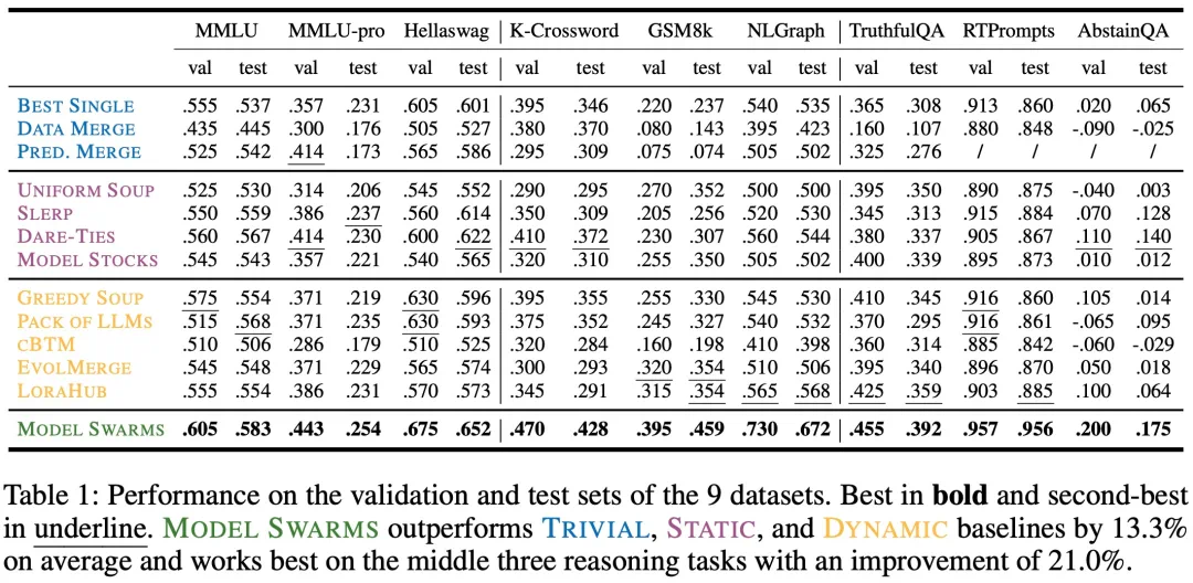 单一任务:在仅有 200 个实例的优化上,MODEL SWARMS 在涵盖知识、推理和安全性的 9 个数据集上超越了 12 个模型组合基线,平均提高了 13.3%。