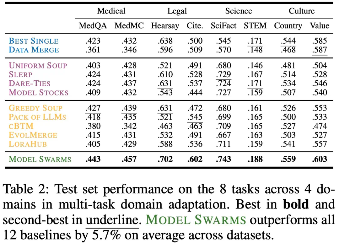 多任务领域:联合优化医疗、法律、科学和文化领域的多个任务,MODEL SWARMS 经常比单独优化单个任务产生更优的帕累托专家。