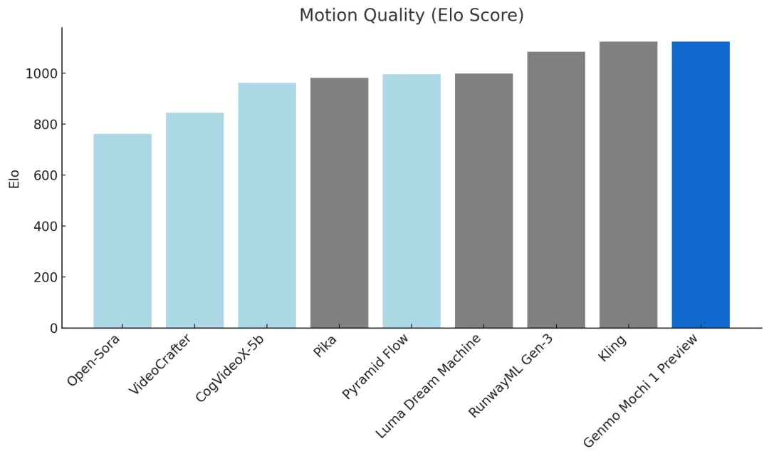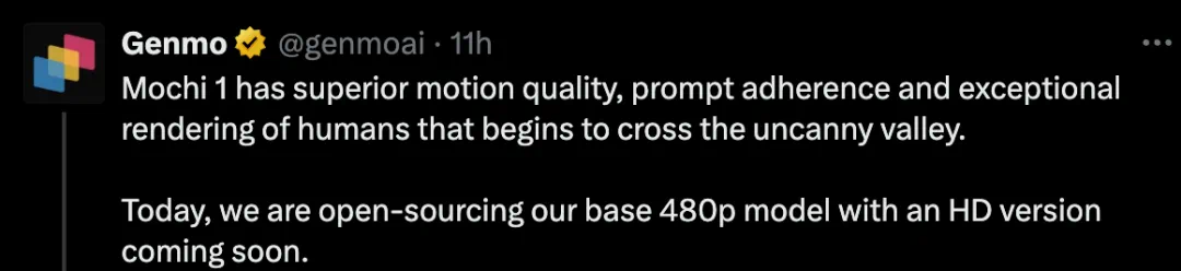 Genmo 在社交媒体上高调宣布:Mochi 1 在运动质量、提示遵循性和人类渲染方面表现出色,甚至超越恐怖谷。