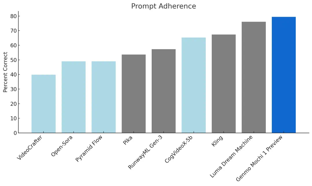 同时,它还声称,在内部测试中,Mochi 1 已经能与 Runway、Luma 、可灵等领先的闭源竞争者打个平手,甚至略胜一筹。