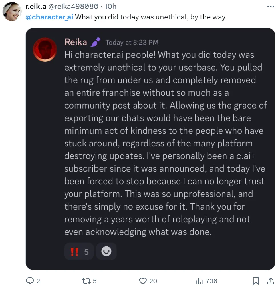 另一位用户 Reika 也在多个平台痛斥 Character.ai 的做法不道德,没有任何预警就删除了用户的角色和聊天记录,甚至没有给导出的机会。