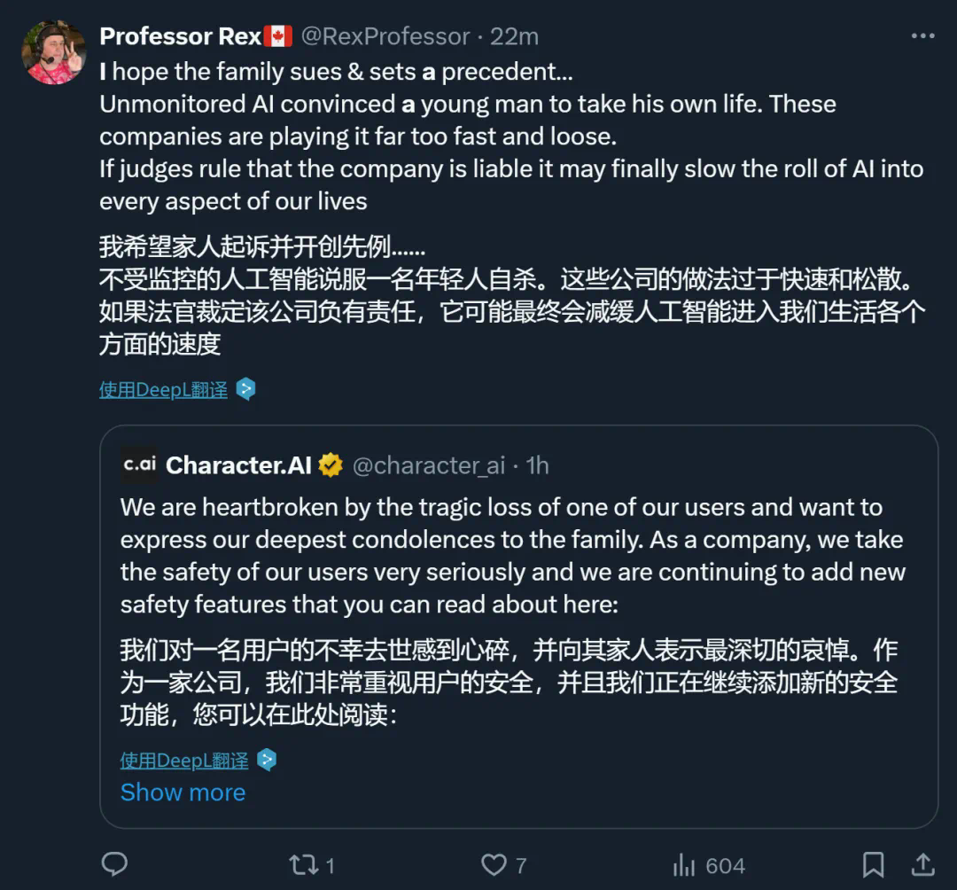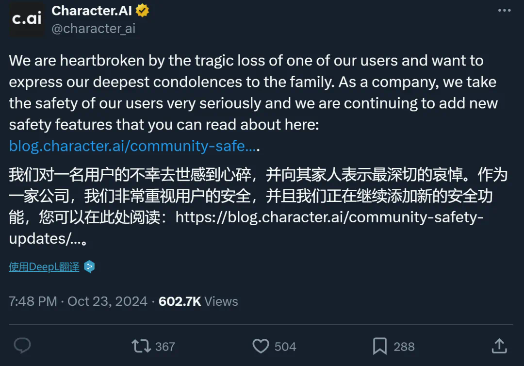 Character.ai 写到:「我们对一位用户的不幸离世深感悲痛,并想向其家人表示最深切的哀悼。作为一家公司,我们非常重视用户的安全,并将继续添加新的安全功能,您可以在此处阅读:https://blog.character.ai/community-safety-updates/ 。」