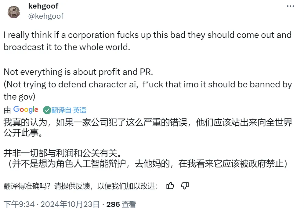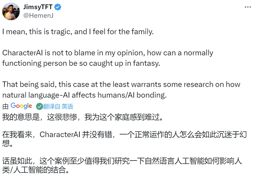 但也有人表示责任不在 Character.ai,因为人本就不应该沉迷在幻想之中。不过话虽如此,这也证明了研究自然语言 AI 对人类的影响的必要性。