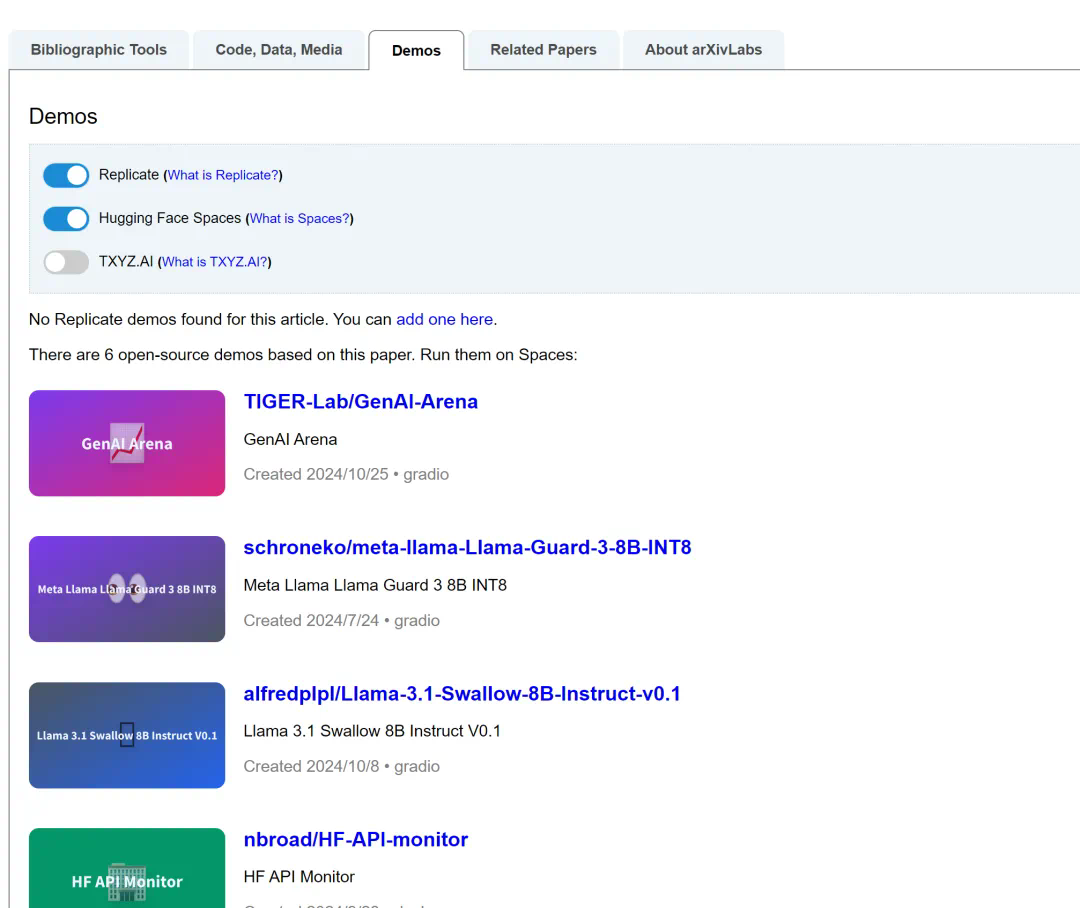 其实,这并不是 arXiv 与 HuggingFace 的首次联动。早在 2022 年 12 月,二者就合作开发了一项新功能,让 Hugging Face Spaces 通过 Demos 选项卡与 arXivLabs 集成。该选项卡包含指向社区或作者自己创建的 Demo 的链接。用户只需将鼠标点到 Demos 选项卡,就可以查看源代码并试用。这一功能有助于提高研究者对模型工作原理的认识和理解,扩大研究人员工作的可见度。