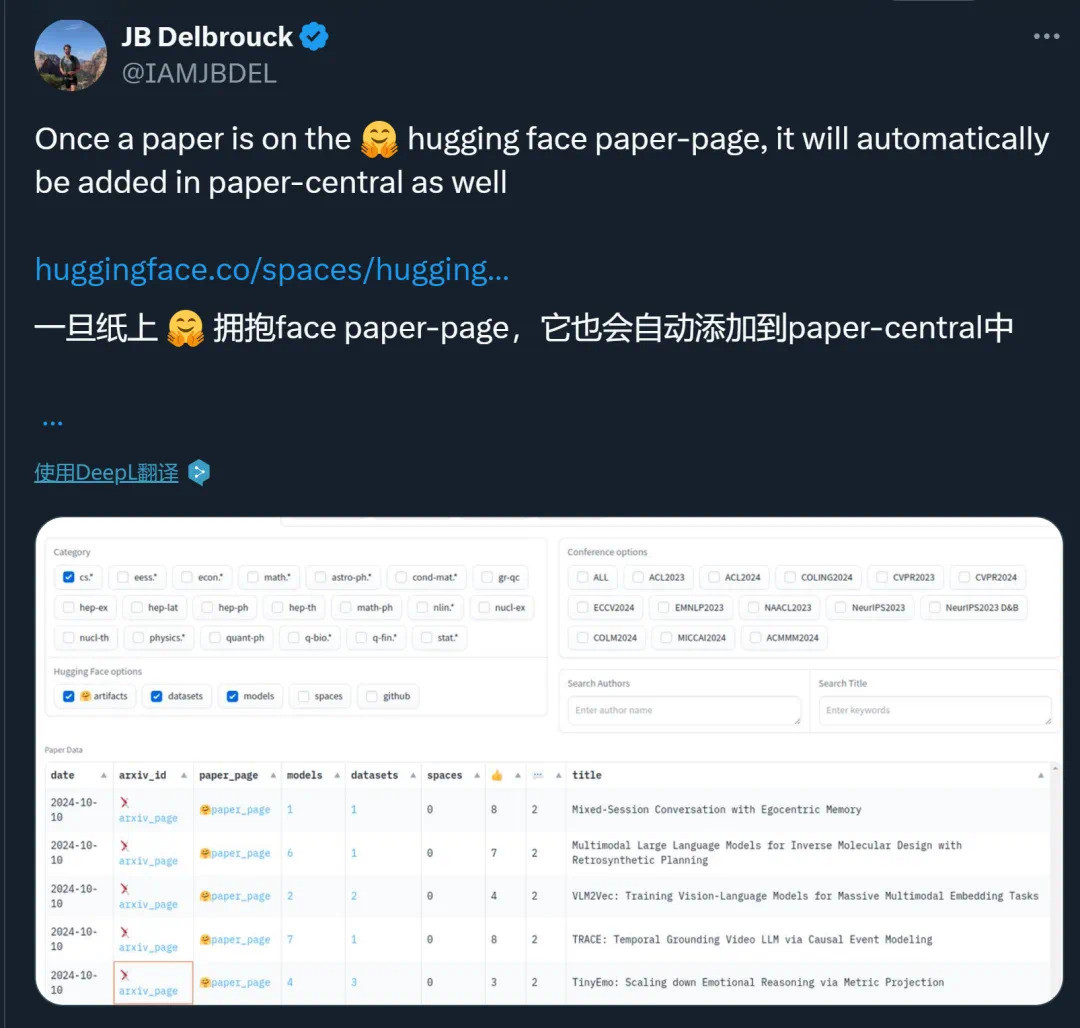 Hugging Face 基础机器学习研究员 JB Delbrouck 提到,一旦一篇论文被放到 Hugging Face 论文页面上,这篇论文将被自动添加到「Paper Central」上。