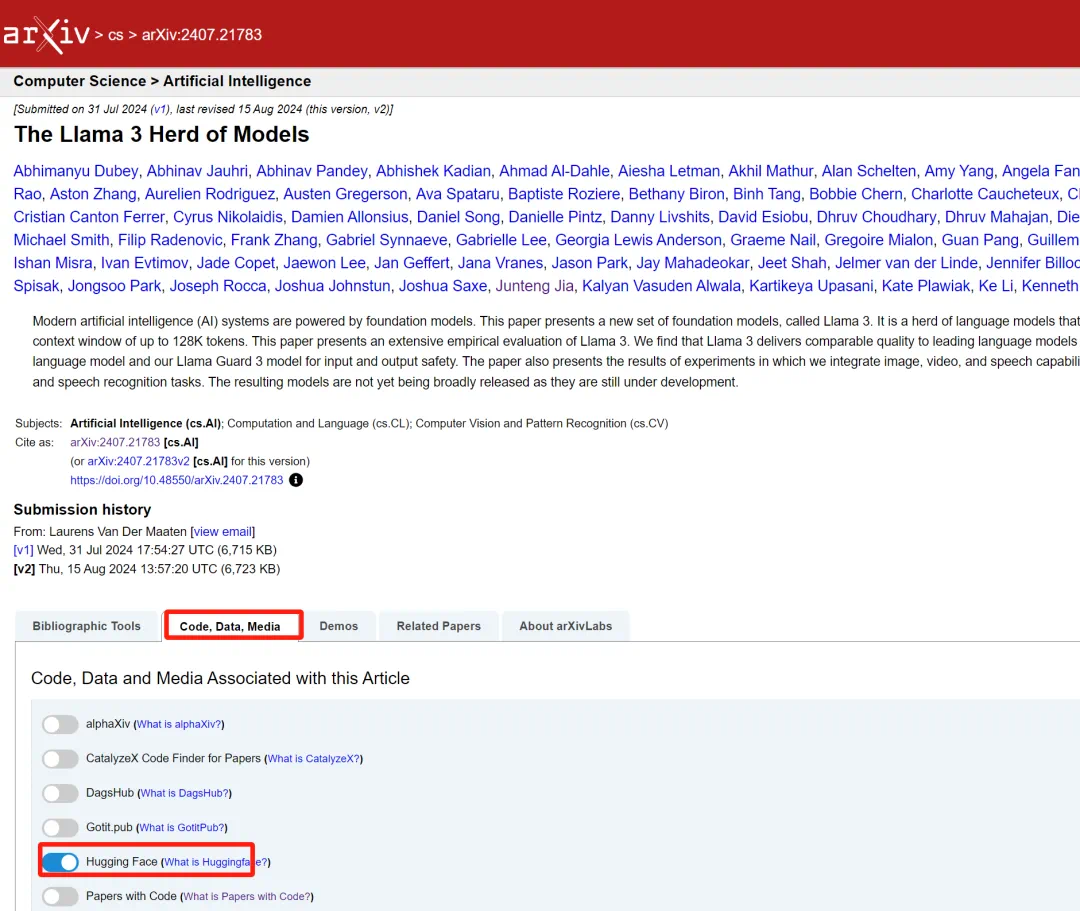 这个新功能(图中的「Hugging Face」按钮)隐藏在「Code, Data, Media」选项卡下,选中之后就可以直达相关的 Hugging Face 论文、模型和数据集。