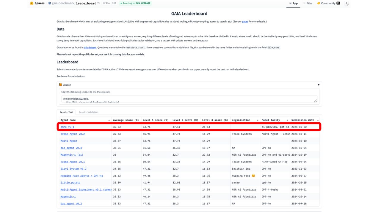 GAIA 是由 Meta AI、Hugging Face 和 AutoGPT 联合推出的基准测试系统,旨在提供一个涵盖真实世界问题集的测试环境,用于全面评估 AI 助手的能力,包括推理、大模型多智能体处理、网页浏览和工具使用等核心功能,是当前最具挑战性的多代理智能评估数据集。OMNE框架能够在如此严苛的榜单中拔得头筹,充分体现了AI 团队的技术深度与创新能力。