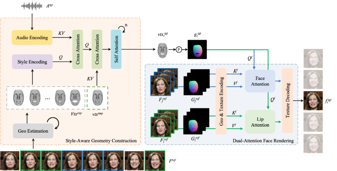 Style-Aware Geometry Construction:这一阶段的目标是在 3D 几何空间中生成具备人物风格的人脸动画。除了通过常规的语音信号来控制生成结果,这里还从参考视频中提取说话者个性化的面部特征并分析出特征的统计特性,通过 Cross Attention 注入到模型中,来引导生成的动画具备说话者本人的面部运动风格。此外,文中还提出了一种 Hybrid 3D Reconstruction 方案,通过结合深度学习和迭代式优化的方法,来提升人脸三维重建的精度和稳定性。 -