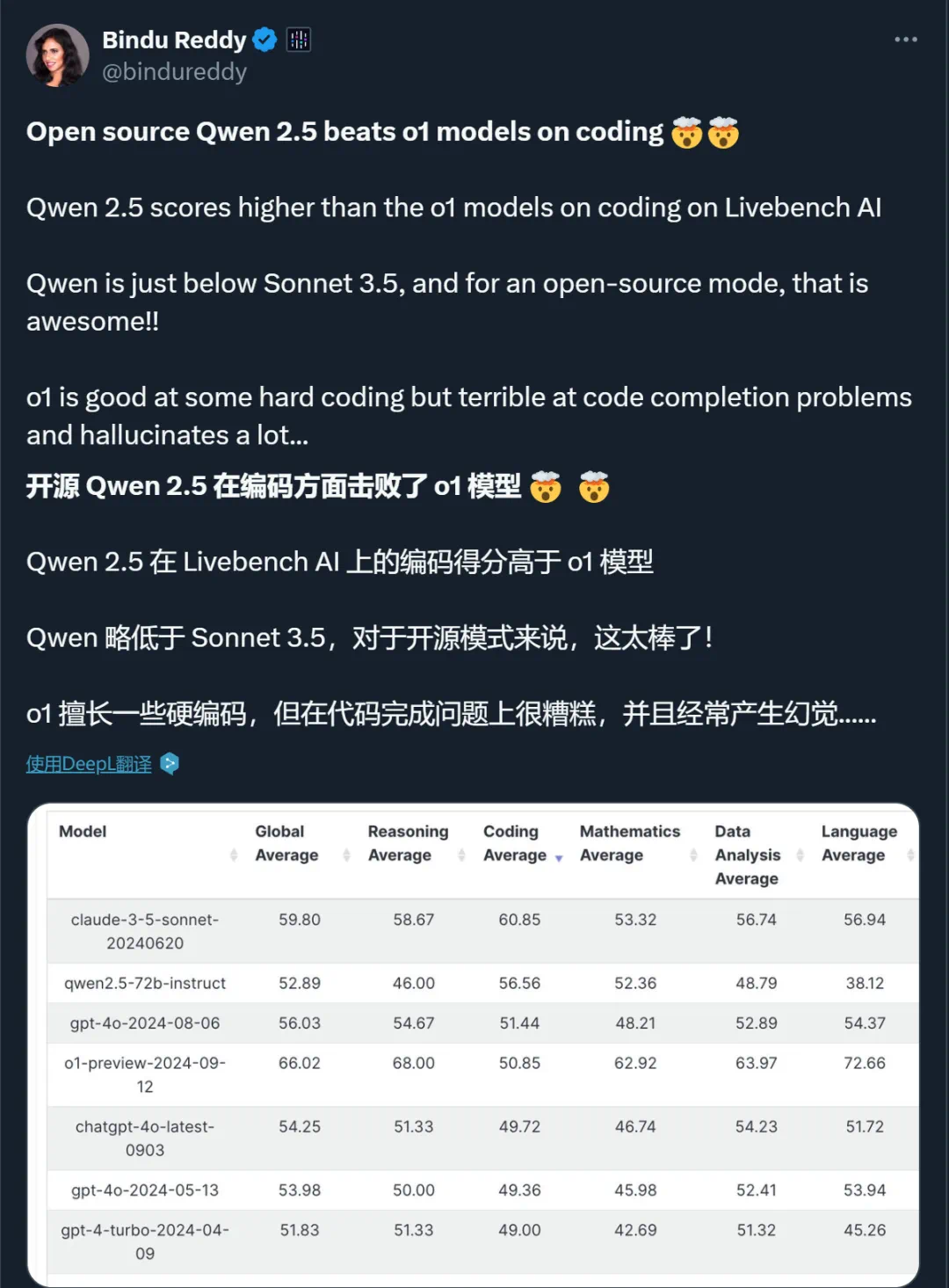 在 9 月底,全球开源社区基于 Qwen 系列二次开发的衍生模型数量已经超过了 Llama 系列,达到了 7.4 万。在 LiveBench 排行榜上,该模型的编码能力得分超过了 OpenAI 的 o1 模型,曾经跻身排行榜第二。在 Chatbot Arena 榜单上,该模型也能排到第五。