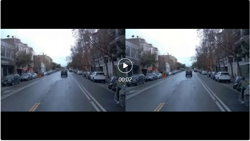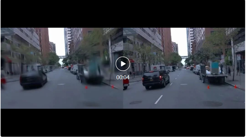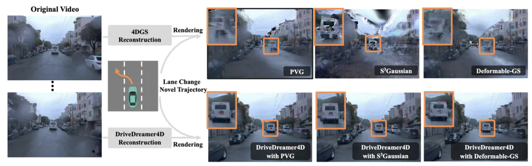 除了变道,在车辆变速场景下,传统算法(PVG,S3Gaussian,Deformable-GS)的表现能力也受到限制,如下第一列视频所示,这些算法在自车加速时,前方的车辆都出现了 “拖影” 现象。而经过 DriveDreamer4D 提升后,渲染的车辆的时空一致性更高。
