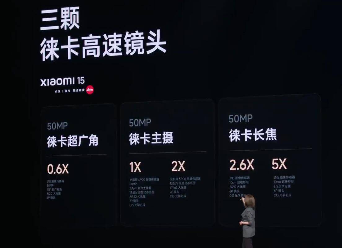 Xiaomi 15 搭载三颗徕卡高速镜头:主摄拥有 Summilux ƒ/1.62 超大光圈,搭配 1/1.31″ 的光影猎人 900 旗舰传感器,带来更快的抓拍速度和更优秀的定格能力;长焦镜头采用全新的 28nm 传感器,支持更丰富的特性;同时延续广受好评的浮动对焦镜组设计,在有限的行程内实现 10cm 到无穷远的超大对焦范围,既能拍摄长焦人像,也能够拍到极具神奇感的近物特写。超广角镜头等效 14mm 焦距,拥有 ƒ/2.2 大光圈,能够拍摄极具视觉张力的风光照片。软件方面,升级 Xiaomi AISP 大模型计算摄影平台 2.0,每秒可计算高达 43 亿像素数据,拍摄全流程全面提速,复杂场景一拍传神。哪怕是叠加「长焦 + 逆光 + 人像」的黄金落日人像拍摄,也能轻松应对。