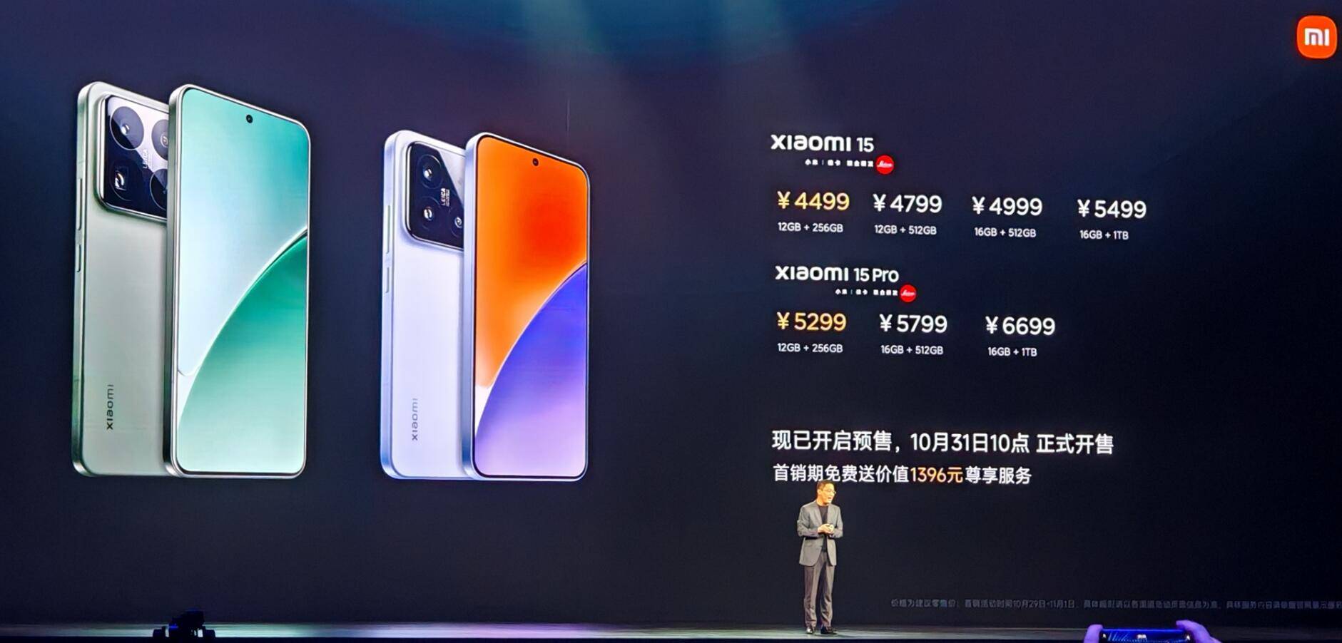 Xiaomi 15 共有白色、黑色、浅草绿、丁香紫四款配色可选,其中 12GB+256GB 售价 4499 元、 12GB+512GB 售价 4799 元、16GB+512GB 售价 4999 元、16GB+1TB 售价 5499 元;Xiaomi 15 Pro 共有岩石灰、云杉绿以及白色三款配色可选,其中 12GB+256GB 售价 5299 元、16GB+512GB 售价 5799 元、16GB+1TB 售价 6499 元;Xiaomi 15 & Xiaomi 15 Pro 均有亮银版本,起售价为 4699 元以及 5499 元。即日起在小米商城、小米之家、小米天猫官方旗舰店以及小米京东旗舰店等官方渠道开启预约,10 月 31 日早 10 点正式开售。