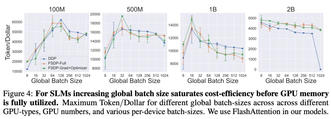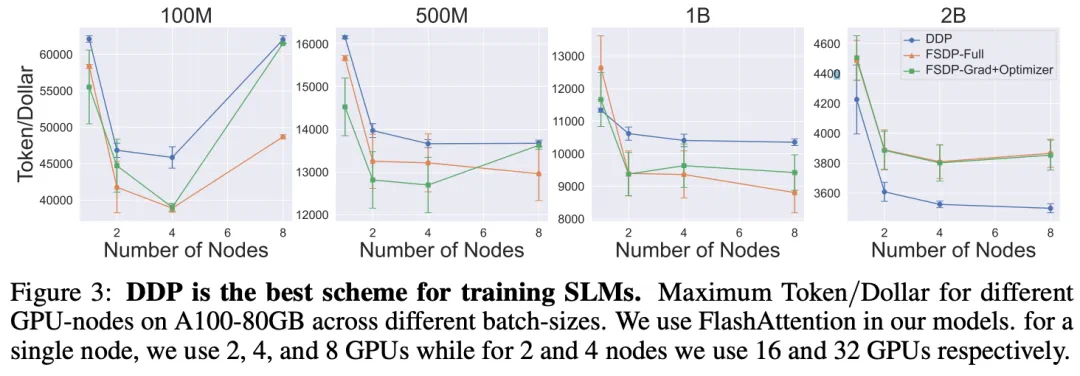 GPU 数量和通信:每种 GPU 类型都有三种主要训练配置,包括:单节点单 GPU(1 台 GPU)、单节点多 GPU(2、4 和 8 台 GPU)和多节点多 GPU(16、32 和 64 台 GPU)。当 GPU 超过 1 台时,还会评估分布式数据并行(DDP)和完全分片式数据并行(FSDP)这两种通信方法。对于分片,他们也研究了两种策略:1) 完全分片,即对所有梯度、优化器状态和权重进行分片;2) grad_op 分片,即仅对梯度和优化器状态进行分片(但权重不分片)。他们使用了 RDMA/EFA。
