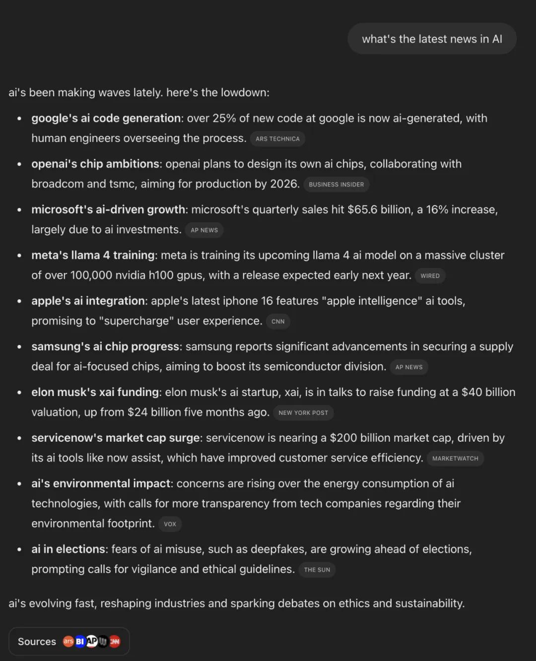 从人们初步的使用效果看来,确实是相当的方便,比如搜个最近的 AI 新闻,结果会是这样的: