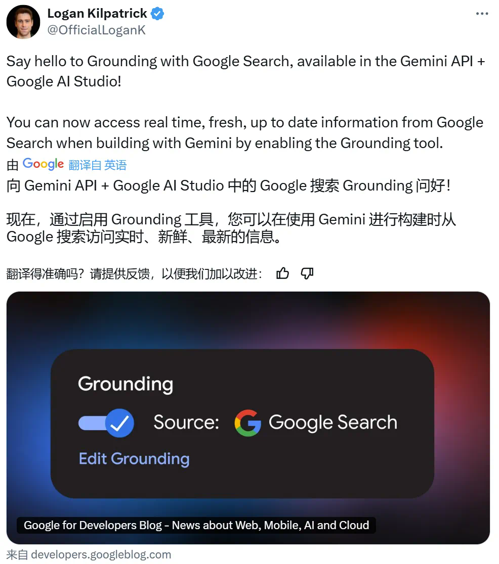 谷歌搜索新推出的 Grounding 功能已向 Gemini API 和 Google AI Studio 用户提供,让他们可以在使用 Gemini 时从谷歌搜索获取实时、新鲜、最新的信息。