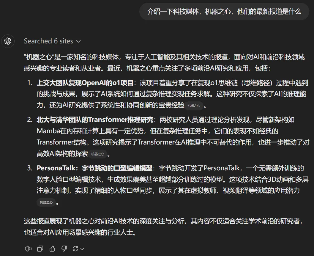 ChatGPT search 的推出正式宣告 ChatGPT 消除了即时信息这一最后短板。现在,人们与全球最先进 AI 大模型聊天时,也可以通过网络资源链接快速、及时地获取答案了。