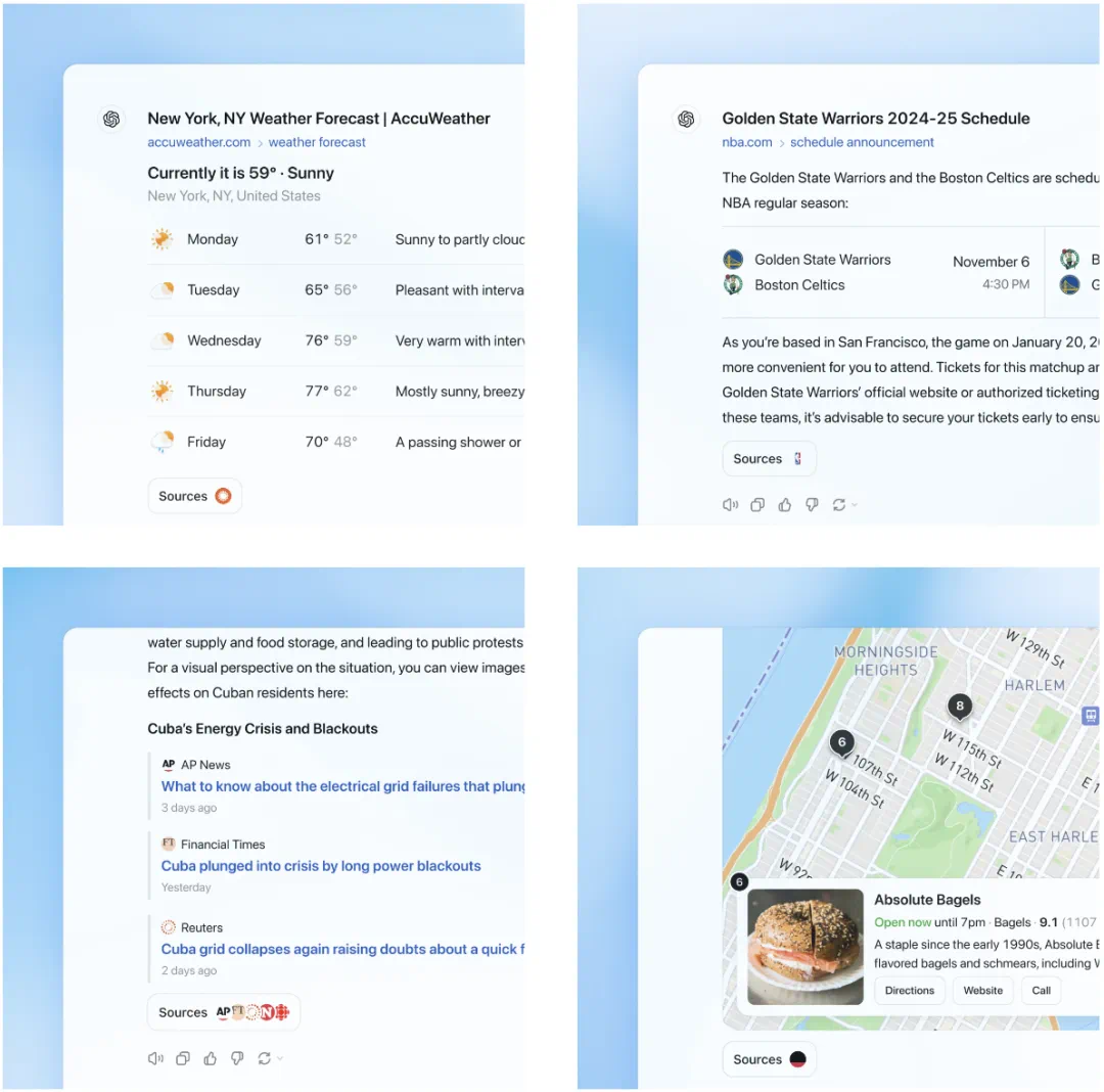 为了补充最新的信息,OpenAI 表示已经与一些新闻和数据提供商达成了合作关系,并且还会为天气、股票、体育运动、新闻和地图等不同类别使用新的视觉设计。