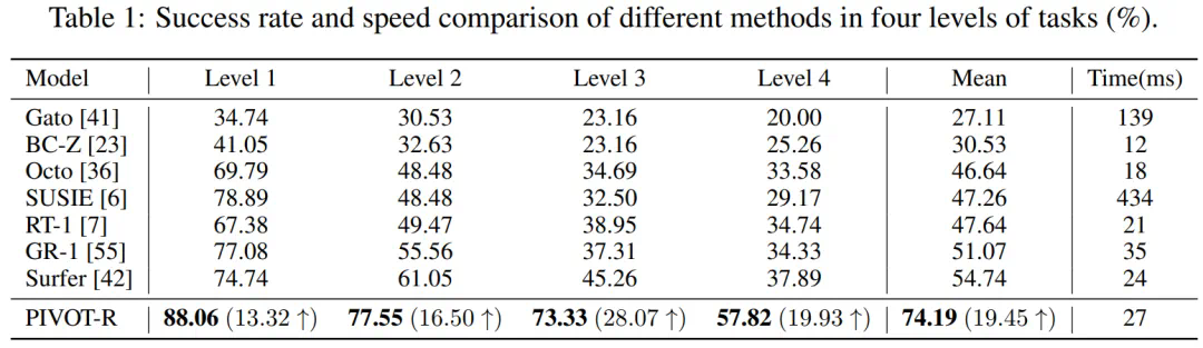 如 Table 1 和 Table 2 所示,PIVOT-R 在仿真环境和真实环境都取得了最优的效果,同时,模型的速度和 RT-1 等方法速度相近,没有因为使用大模型而导致速度变慢。