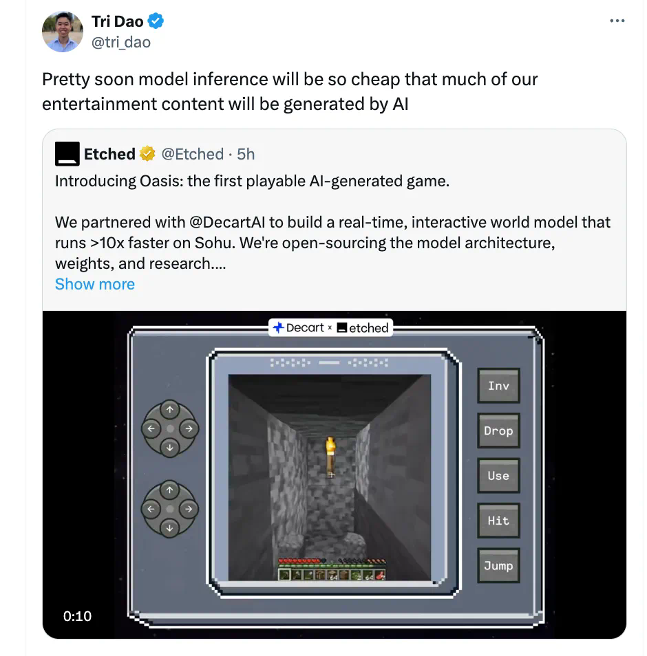 模型权重:https://huggingface.co/Etched/oasis-500m/blob/main/media/thumb.png