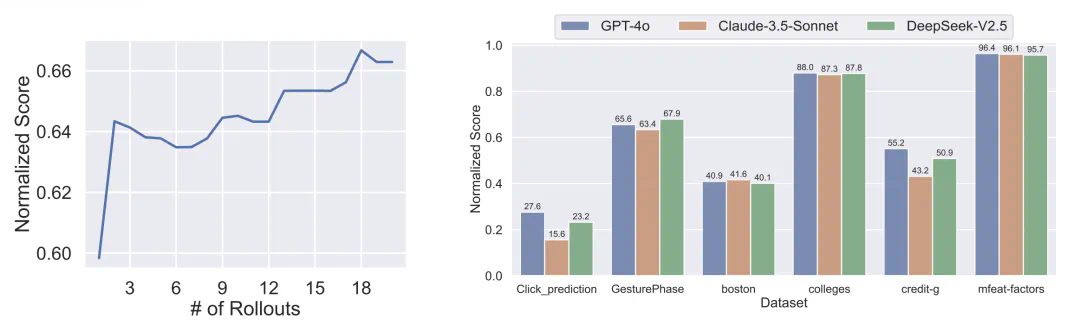 其次,LLM 的消融研究对比了 GPT-4o、Claude-3.5-Sonnet 和 DeepSeek-V2.5,结果表明 Claude-3.5-Sonnet 和 GPT-4o 表现稳定且适应性强,而 DeepSeek-V2.5 在某些数据集上略逊色,但在 Click prediction 和 boston 数据集上表现相近,充分说明 SELA 在不同模型上均有出色表现。