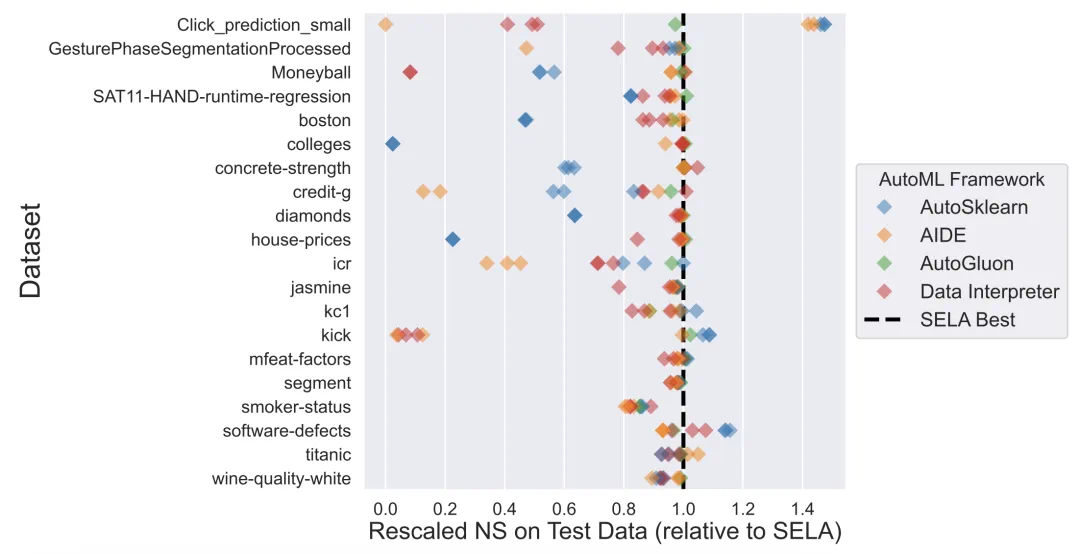 图中展示了多个自动机器学习框架在不同数据集上的预测表现,横轴为与 SELA 最佳性能相比的标准化得分(NS)。结果显示,SELA 在大多数数据集中表现优异,其他框架如 AutoSklearn、AIDE、AutoGluon 和 Data Interpreter 在某些数据集上有竞争力,但整体上 SELA 展现出更为一致的高性能和适应性。