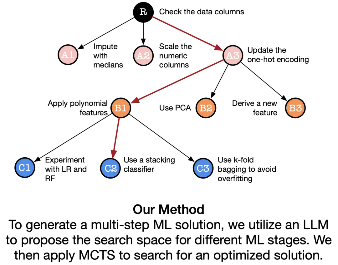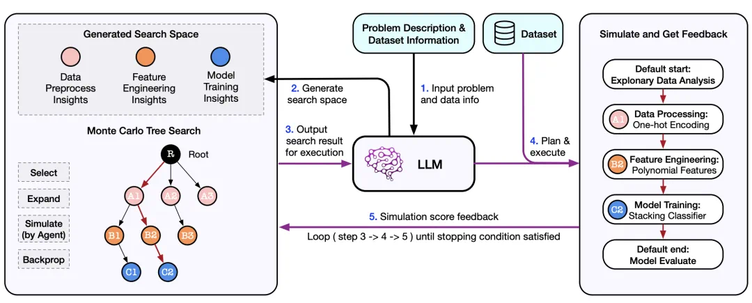 SELA 通过将问题描述和数据集信息输入 LLM,生成潜在解决方案的搜索空间,并由 Monte Carlo Tree Search(MCTS)进行探索。LLM Agent 进一步规划、编码和执行实验,利用模拟反馈优化搜索,形成迭代过程,最终产生优化的实验管道。这种方法模拟了人类专家的迭代和反馈驱动过程,提升了机器学习任务的性能和适应性。