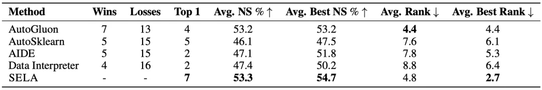 所有数据集按相同比例切分,确保各框架接受相同数据。基于 LLM 的框架(SELA、Data Interpreter 和 AIDE)采用相同配置和迭代次数。AutoGluon 和 AutoSklearn 均使用默认设置。由于 AutoGluon 结果是确定性所以只运行一次,其余实验均运行三次。我们对每个数据集上不同框架的全部运行结果进行排名,以比较优劣。