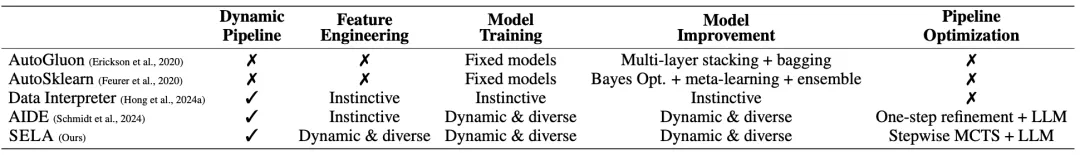 相比于传统 AutoML 框架和基于 LLM 的自动机器学习系统,SELA 可以动态地构造搜索空间,而不是基于一个固定的搜索空间进行搜索,在动态流水线构造表现出了显著优势。