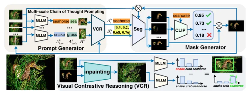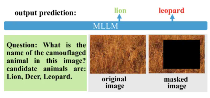 尽管如 SAM 这类大型分割模型的存在,能够在提供较为精确的位置描述时有效地进行物体分割,但在伪装样本分割或医学图像分割等复杂任务中,获取这种精确描述并不容易。以往的研究,如 GenSAM [1],提出利用 LLaVA/BLIP2 这类多模态大模型(MLLMs)来推理出特定样本的分割提示,以指导分割过程。然而,这种方法在处理像伪装样本分割这样的场景时,往往因为目标共现偏差(object co-occasion bias)存在而导致问题。例如,在一个只有草原的图像中,如果训练数据中狮子通常与草原共现,LLaVA 可能会偏向于预测草原中存在伪装的狮子,即使图中实际上没有狮子。这种假设的偏好在伪装动物分割任务中尤其问题严重,因为它可能导致模型错误地识别出不存在的伪装动物。