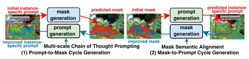 如图 2 所示,该研究提出了一个循环优化的 ProMaC 框架,它包括两部分:利用幻觉来从任务通用提示中推理出样本特有提示的 multi-scale chain of thought prompting 模块和将生成的掩码与任务语义相对齐的 mask semantic alignment 模块。前者推断出较为准确的样本特有提示来引导 SAM 进行分割,后者则将生成的掩码与任务语义进行对齐,对齐后的掩码又可以作为提示反向作用于第一个模块来验证利用幻觉得到的信息。通过循环优化来逐渐获得准确的掩码