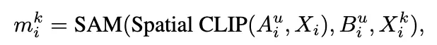 获得的样本特有提示将被送入掩码生成器来产生准确的掩码。首先,样本特有提示被输入到分割模块(SAM)以生成一个掩码。然而,SAM 缺乏语义理解能力,它主要依据给定的提示及其周围的纹理来识别可能要分割的物体。因此,该研究采用了 CLIP 来评估相同提示在不同图像块上生成的各个掩码与目标物体之间的语义相似性。这种方法有助于确保分割结果的准确性和相关性:
