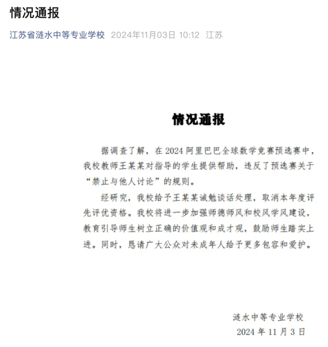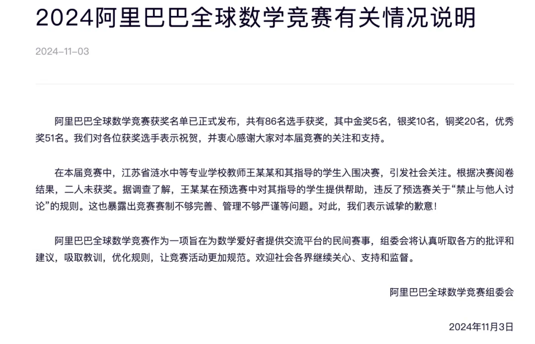 在《2024 阿里巴巴全球数学竞赛有关情况说明》中, 阿里表示,「在本届竞赛中,江苏省涟水中等专业学校教师王某某和其指导的学生入围决赛,引发社会关注。根据决赛阅卷结果,二人未获奖。据调查了解,王某某在预选赛中对其指导的学生提供帮助,违反了预选赛关于 “禁止与他人讨论” 的规则。这也暴露出竞赛赛制不够完善、管理不够严谨等问题。对此,我们表示诚挚的歉意!」