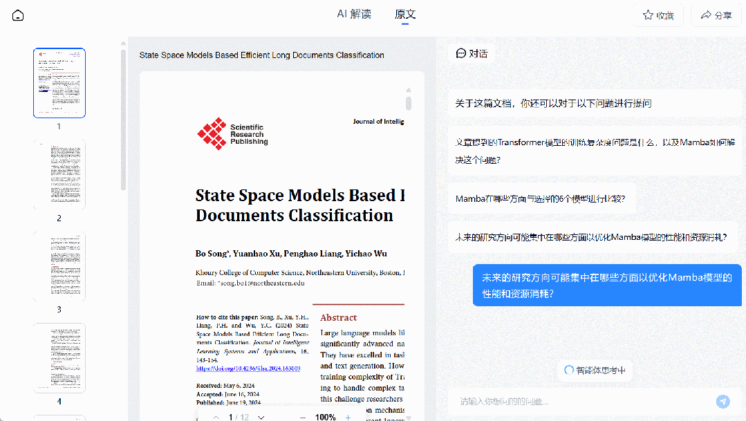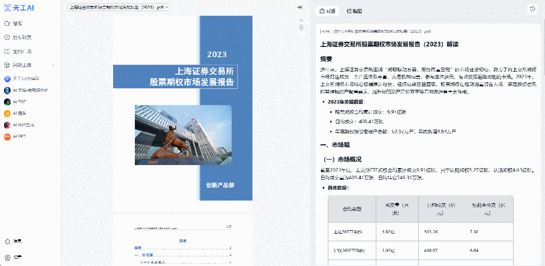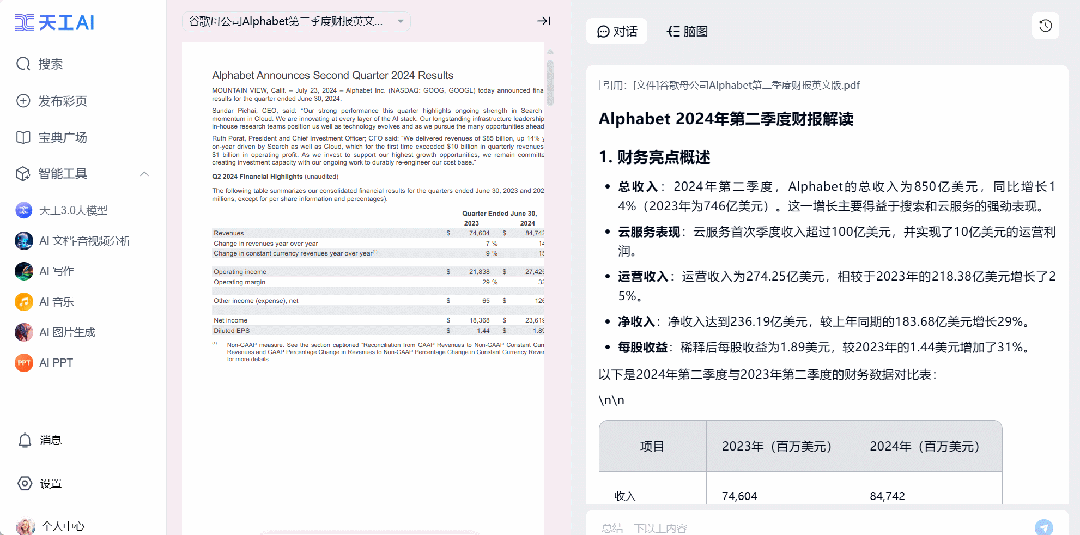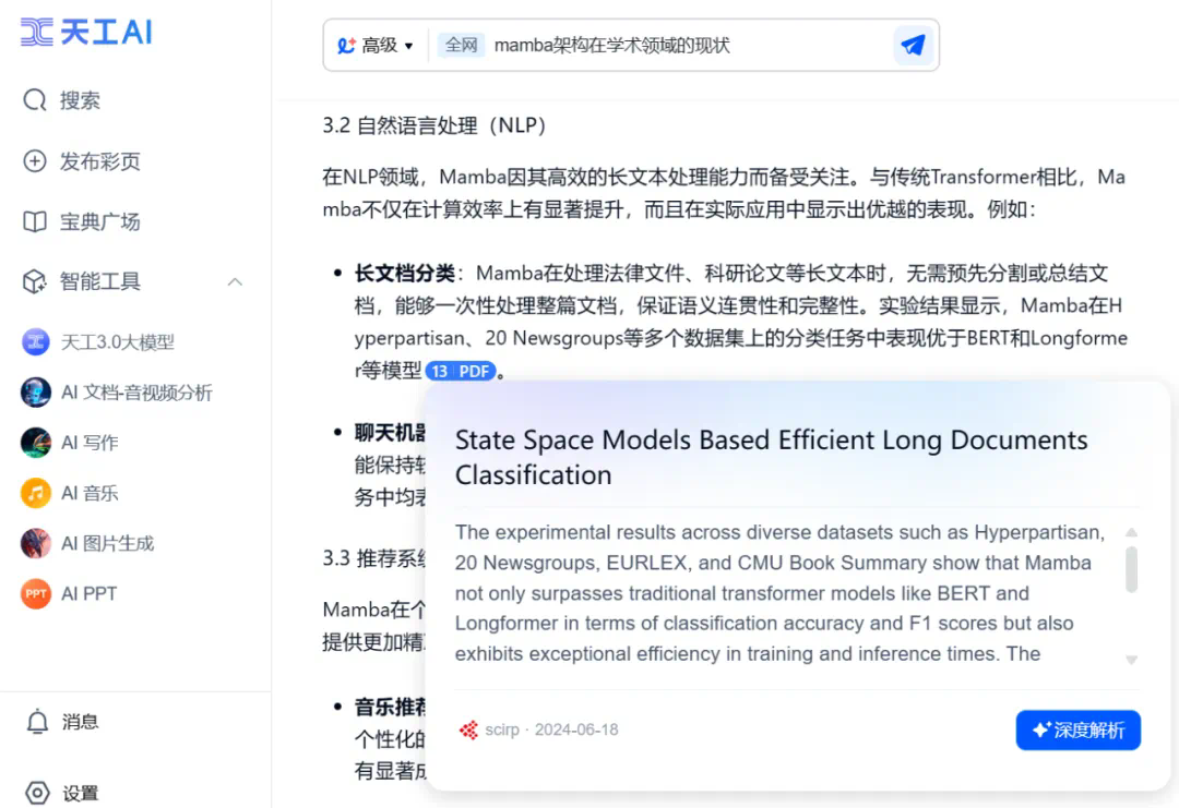其中高质量的 PDF 学术信源以悬浮窗的方式引入到搜索结果中,并显示标题、期刊、发布日期、原文等信息。并且对于想要更深入了解引用论文原文的用户,天工 AI 提供了「深度解析」功能,可以利用该功能进行延展精读。