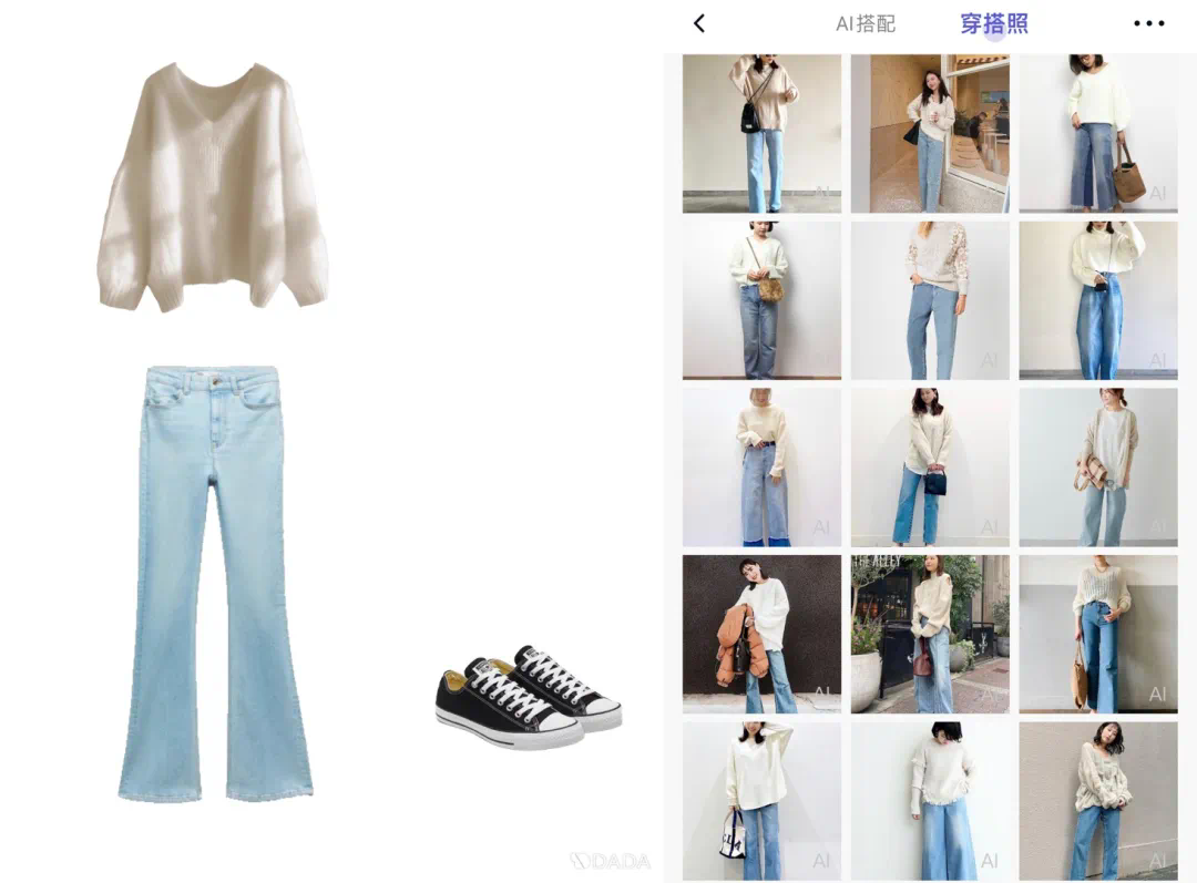 比如,我们上传了慵懒风毛衣和浅色牛仔裤,它就能自动给出一堆 AI 穿搭照。