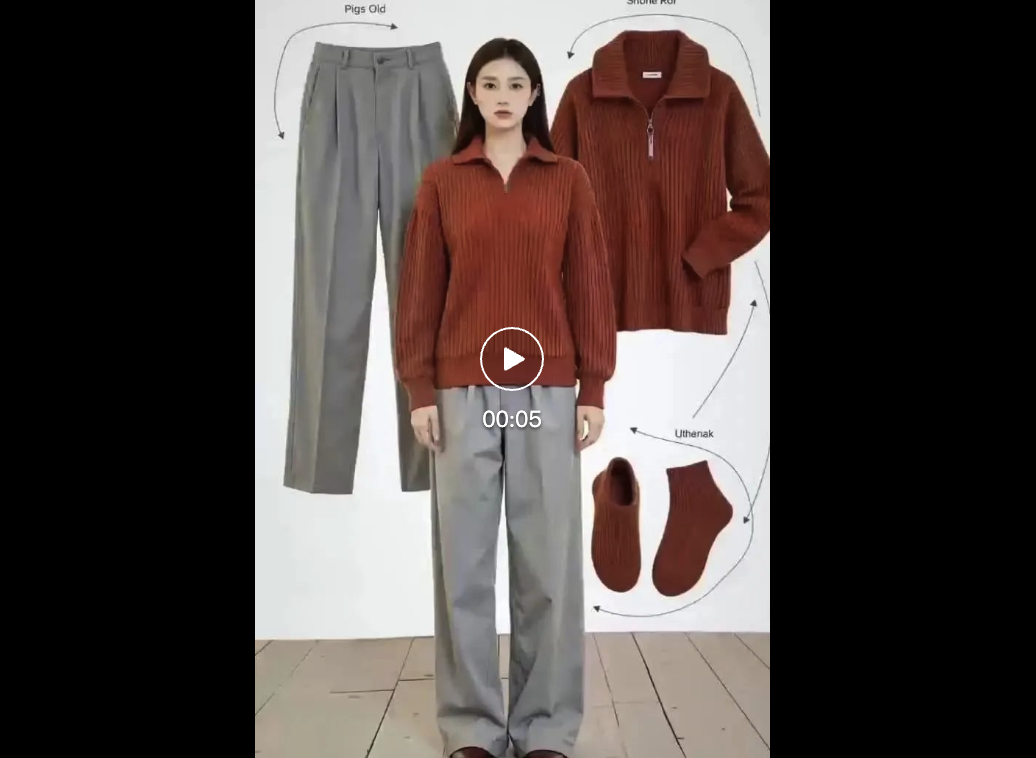 比如,上传一张枣红色毛衣和一条灰色西装裤的图片,先让 AI 跑图,生成模特穿搭照。