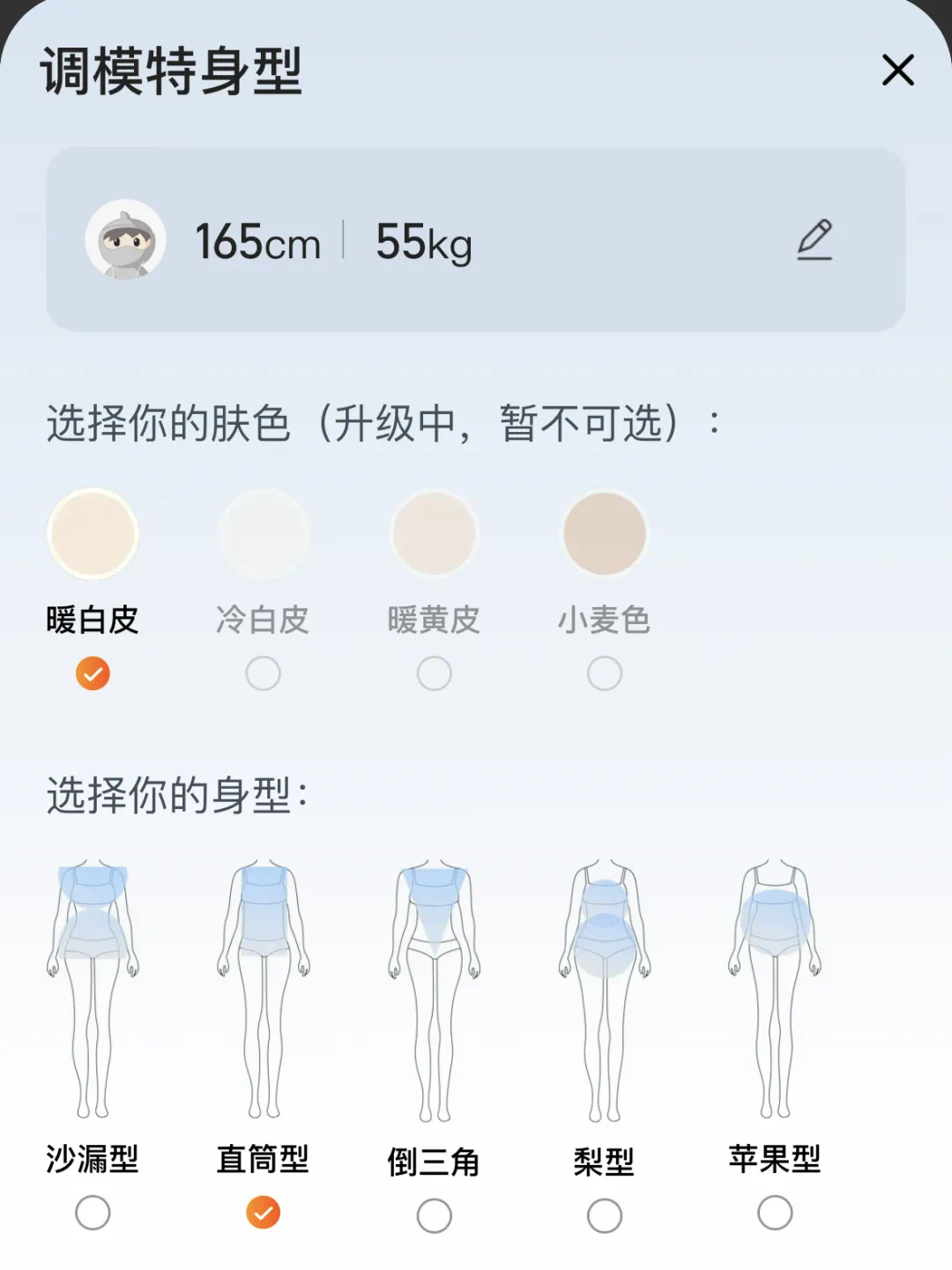 还可以根据自身情况,调整模特的身型、肤色以及身高体重等。