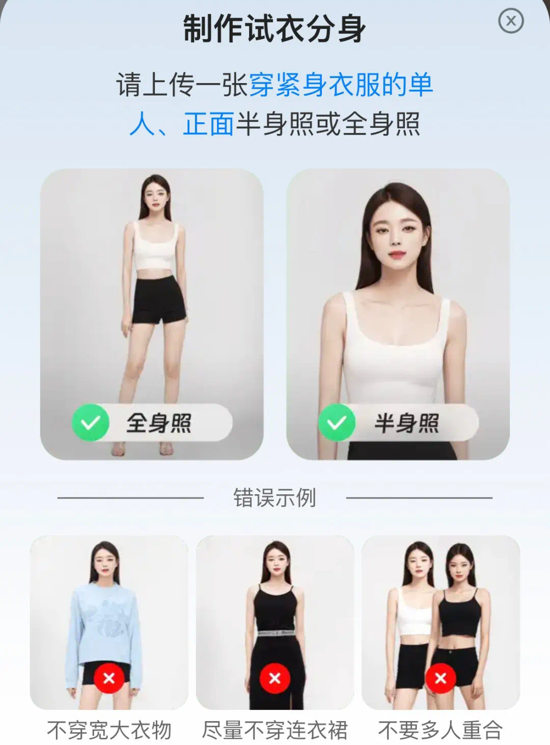 为了试衣效果更佳,不要穿宽大的衣物,也尽量不穿连衣裙,更不要多人重合。