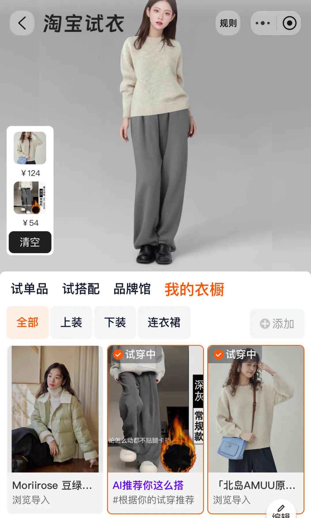 比如我们试穿慵懒风毛衣时,页面会跳出推荐穿搭的裤子。