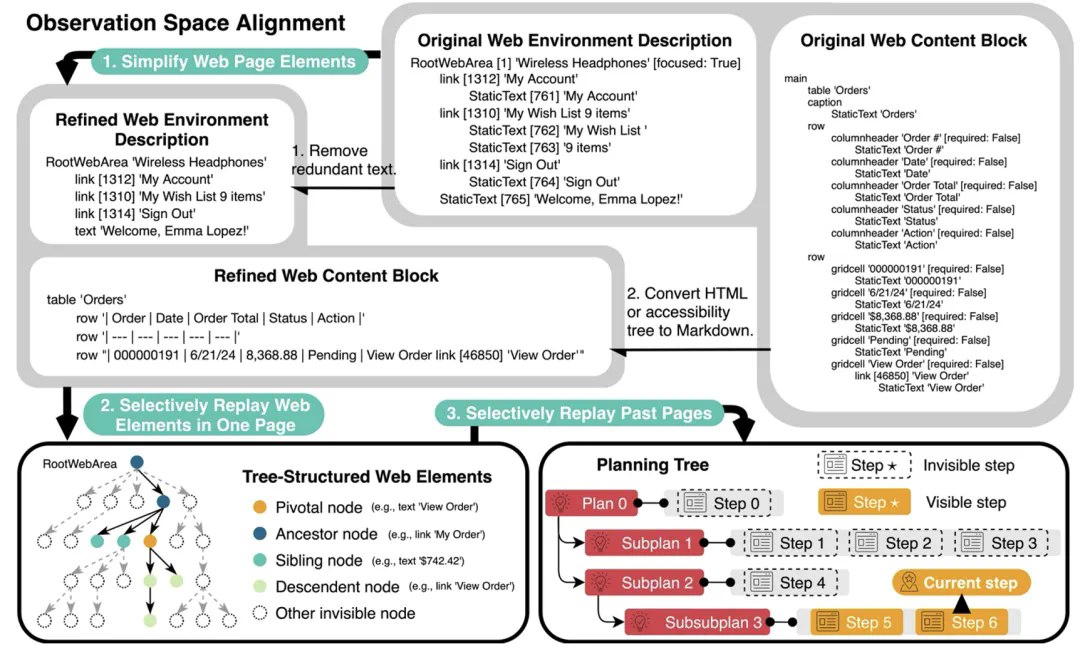 其次,消除冗余和不相关的网页元素,并重构网页内容块,以获取更简洁但同样信息丰富的表示,从而精炼观察空间;