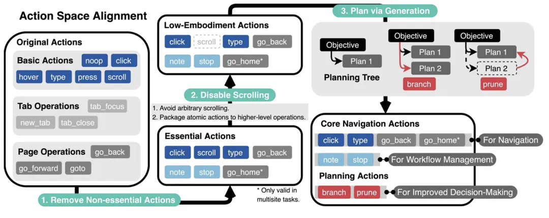 最后,引入两个规划动作(分支和修剪),这使得智能体能够以规划树结构自组织导航工作流,并使用相同结构过滤历史步以进行回放。