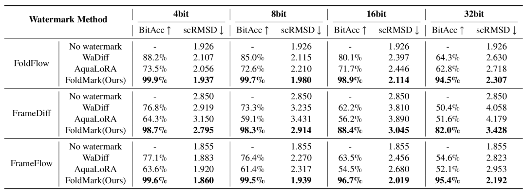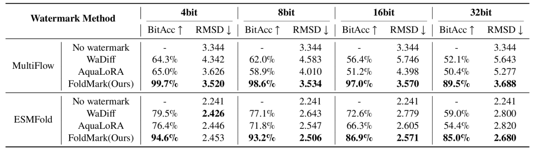 实验结果表明,FoldMark 在 16 位水印代码下,能够以接近 100% 的准确率从编码的蛋白质结构中恢复出水印信息。