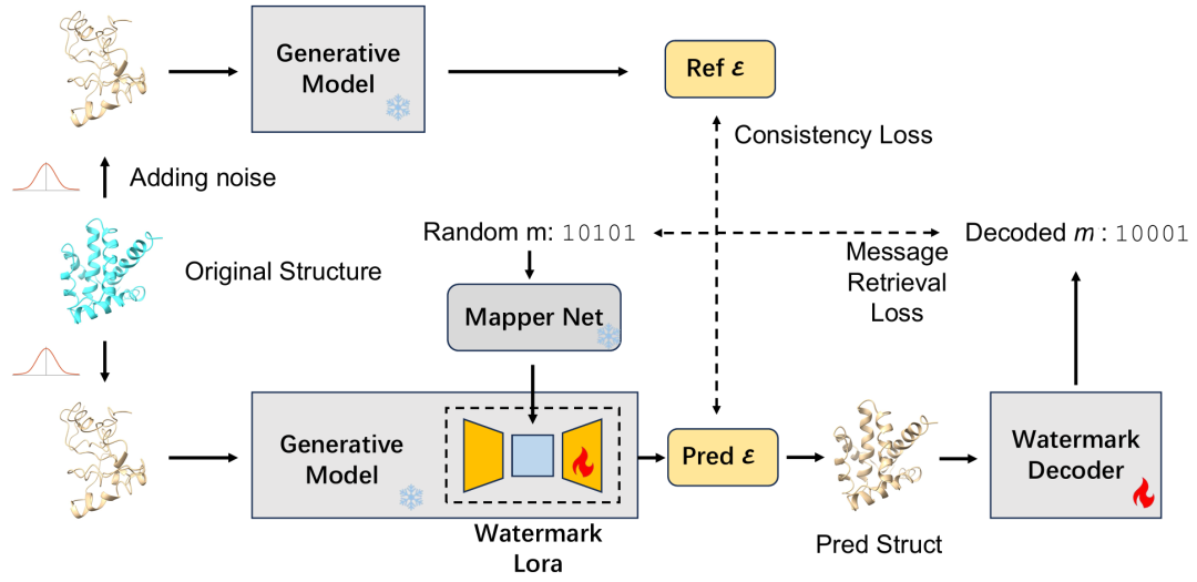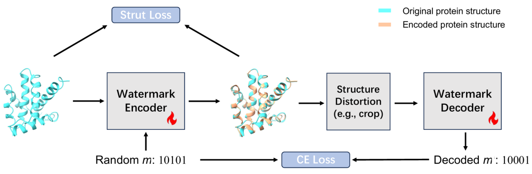 为此,训练过程使用两个损失函数进行优化:一是消息恢复损失,确保能从嵌入的结构中准确提取水印信息;二是结构一致性损失,确保嵌入水印后的蛋白质结构与原始结构之间的偏差最小。