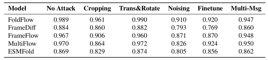 结果显示,FoldMark 能够抵抗这些后处理和攻击,因为水印信息被嵌入到每个残基中,且解码器对 SE(3) 变化不敏感。
